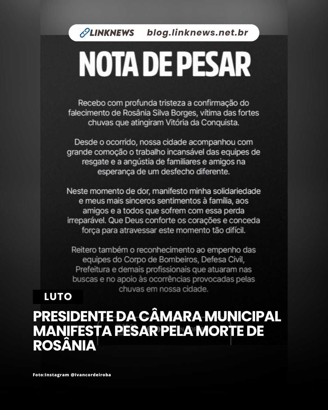 O presidente da Câmara Municipal de Vitória da Conquista, Ivan Cordeiro, divulgou uma nota de pesar pelo falecimento de Rosânia Silva Borges, vítima das fortes chuvas que atingiram o município.